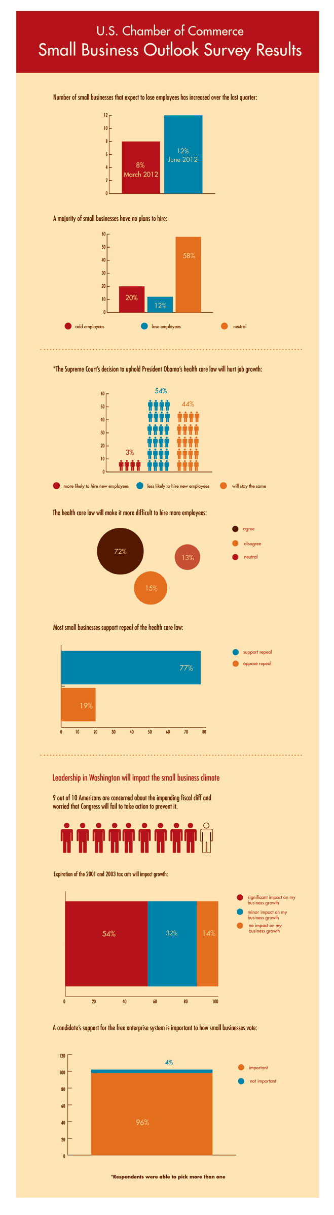 Following the Supreme Court’s decision on the President’s health care law, only 3% of small business owners report that the Supreme Court’s decision to uphold the law will make them more likely to hire new employees. Seventy-two percent said the health care law will make it harder for them to hire. When asked about the impact, several respondents said they will scale back their workforce to avoid triggering the employer mandate.