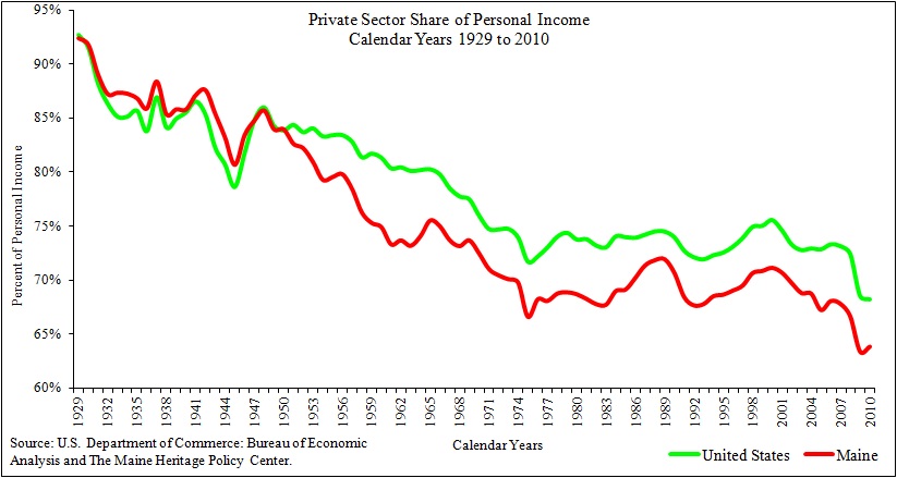 This is what Iโve been showing for years with the chart below showing Maineโs private sector share of personal income on a perpetual downward trend.