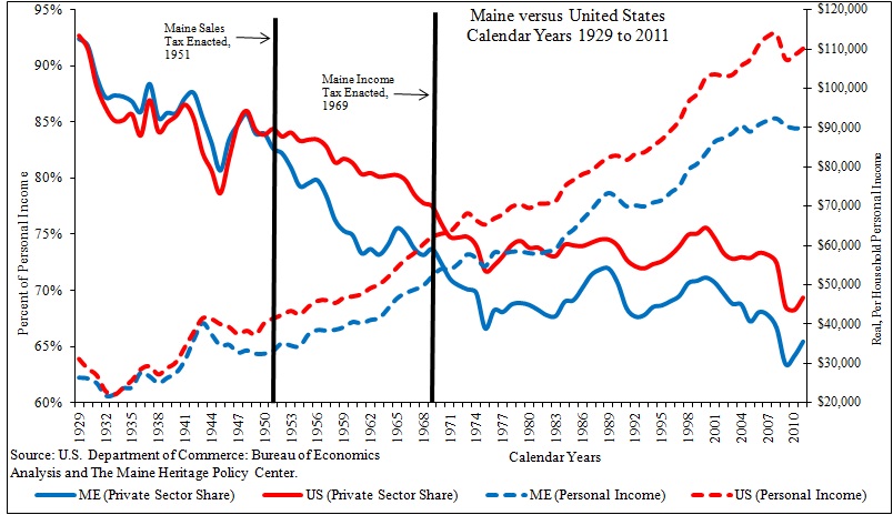 Maine’s private-sector share of personal income is now 65.5 percent, compared to 69.3 percent nationally.