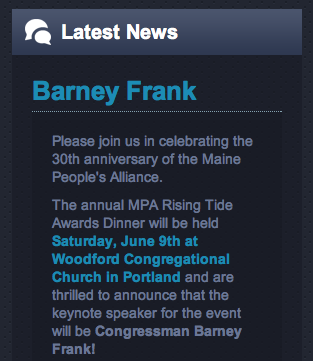 The MPA is advertising their 30th Anniversary celebration this year with guest speaker…drum roll…Barney Frank! The good congressman is a frequent visitor to Maine, where his partner Jim Ready is from. He is also known to jet set to the Virgin Islands with his good friend Chellie Pingree and her hubby billionaire and Maine Today Media owner Donald Sussman.