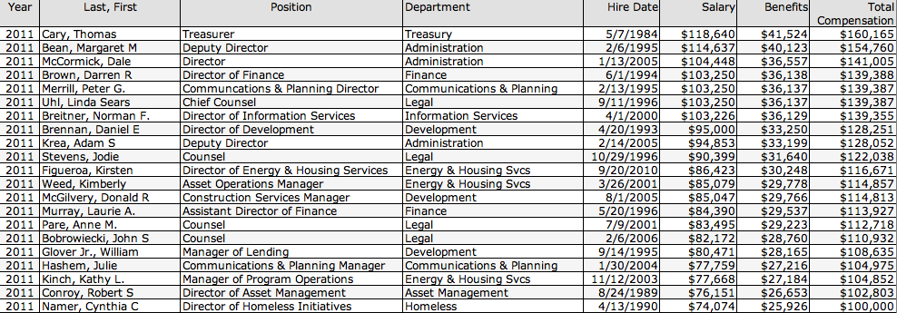 The top seven most highly paid employees at MaineHousing, who all take home more than $100,000 in base salary, received raises in the $3,000 range in 2011. The top seven most highly paid employees for 2011 are listed below with their total compensation as reported on MaineOpenGov.org: