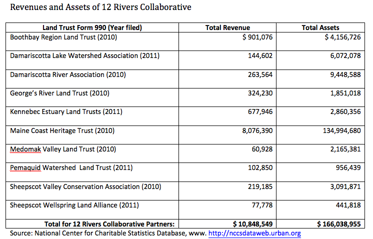 A grant application found at http://www.environmentalfundersnetwork.org/wp-content/uploads/2010-SVCA.pdf describes the goal of the 12 Rivers project as seeking to “accelerate land protection in midcoast Maine by aggregating resources and conservation strategies into a single effort.” With the funds, the collaborative undertakes public and individual outreach efforts to engage the professional forestry community, local municipalities and private landowners.