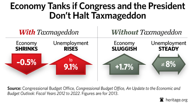 Preventing Taxmageddon and the fiscal cliff are necessary just to keep the economy from taking a nosedive. The status quo isn’t attractive, but Congress certainly shouldn’t make things worse. If Congress moves to prevent the nosedive, the CBO projects that the economy will grow only slightly next year, at an anemic 1.7 percent, and the unemployment rate will remain stuck around 8 percent.