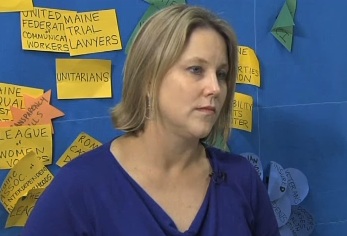 Jennifer Rooks of MPBN conducted an interview at the office of the Maine Small Business Coalition. On the wall behind her, note the “small businesses” that are part of the coalition: Maine Equal Justice League, Unitarians, Maine Trial Lawyers, United Federation of Communications Workers, League of Women Voters and Maine Association of Interdependent Neighborhoods. See her interview here.