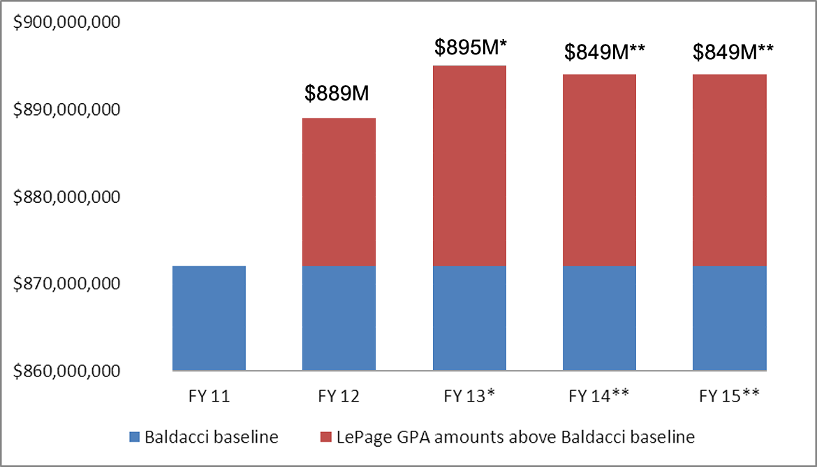 (* The amount listed for FY 13 is after the curtailment of GPA enacted in the recent supplemental budget.** The $894 million listed for FY 14 and FY 15 is the net amount committed by the state after $27 million in new money is added to GPA to partially offset the $28 million in new costs to districts created by having those districts pay the normal pension costs for their employees. The actual proposed amount for GPA for FY 14 and FY 15 is roughly $922 million.)