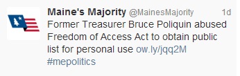 Korzen, an author and former labor organizer, had earlier issued a press release via MainesMajority.org alleging that Poliquin’s use of emails acquired through public records requests “constitutes a blatant abuse of the Freedom of Access Act.”