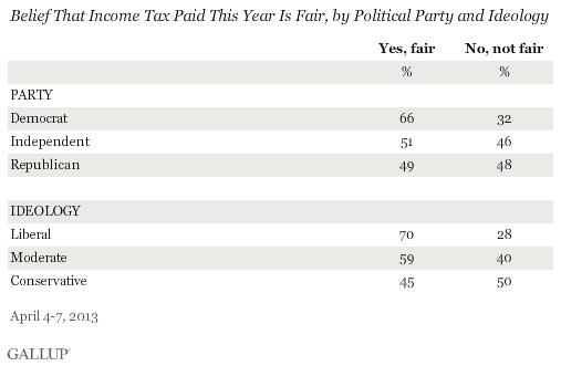 While 70 percent of self-identified “liberals” believe their 2012 tax bill was fair, only 45 percent of self-identified conservatives agreed.