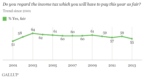 As Americans nationwide prepare to fork over Uncle Sam’s pound of flesh, 55 percent of respondents questioned in a Gallup poll report that their level of taxation is fair. This is the lowest percentage Gallup has measured since 2001.