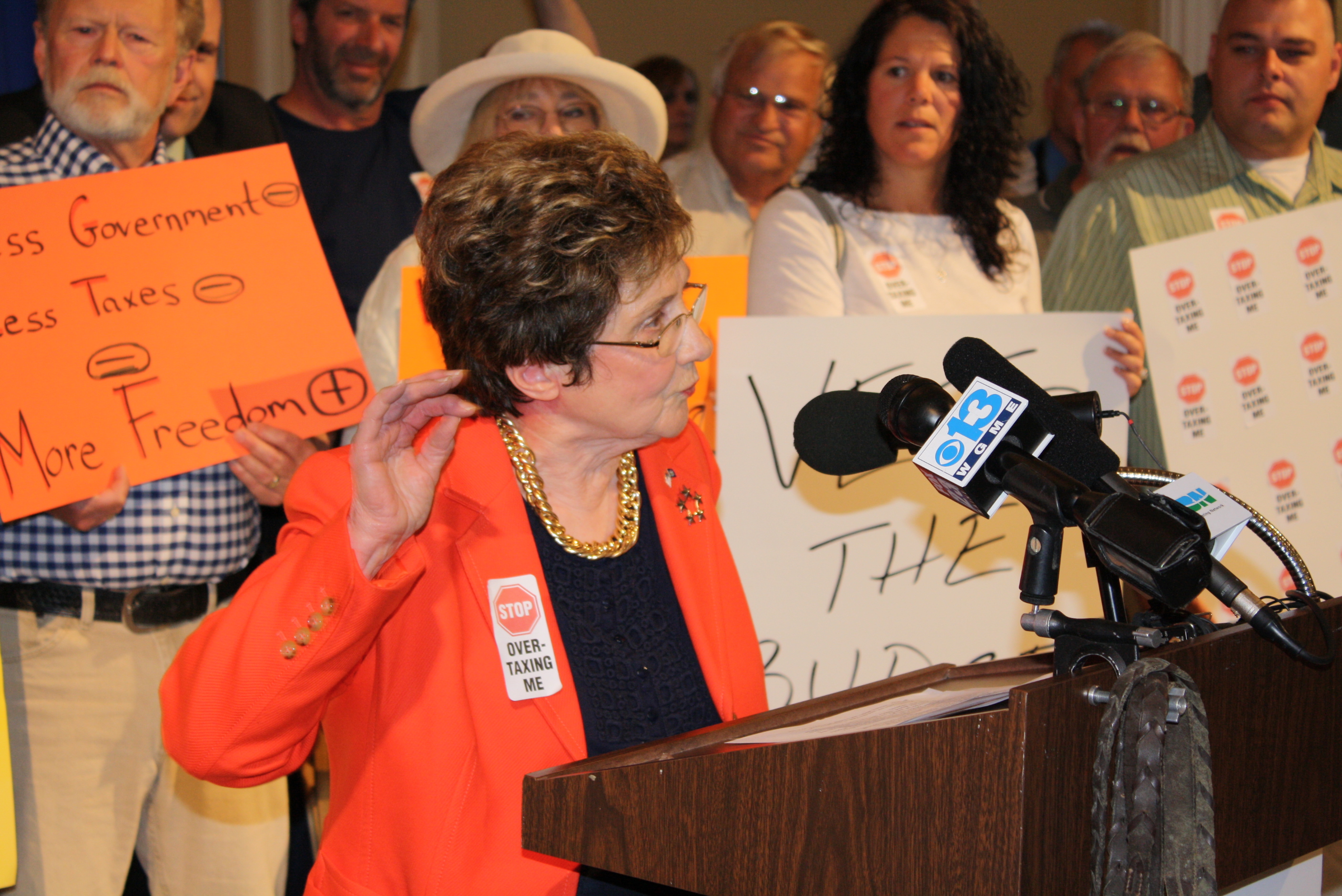 Mary Adams, Maine Chair of the Taxpayer Protection Pledge project, has been in the Augusta fighting against taxes and for limited government for more than four decades. Following the governor’s remarks, she delivered a rousing speech in support of LePage’s veto, and offered some harsh words for the press, too.