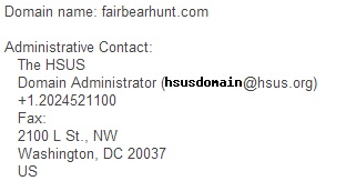 FairBearHunt.com contains no disclaimer about the source of its funding or who is in control of its content. The website projects the appearance of a locally cultivated citizens’ movement in favor of legislation to ban traditional bear hunting methods. However, a review of the site’s registration information provided by WhoIs.com shows that the website was registered in March via the Washington, D.C. headquarters of the Humane Society of the United States (HSUS).
