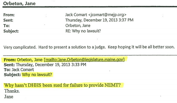 Wrote Orbeton, โAlthough I decline an interview I would explain that in discussions of the performance by the MaineCare non-emergency transportation contractors I had been asked why DHHS had not been sued.ย I asked the question as a general question in my capacity as staff to the HHS Committee.โ