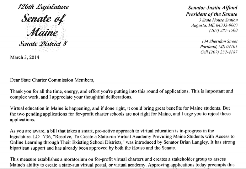 Charter School Commission: Monday was a big day for the Maine Charter School Commission. Connections Academy, a virtual school, won approval, while K-12, another virtual school, was denied for a third time. The controversial Lewiston-Auburn Academy Charter School (LAACS) went down in flames with a unanimous vote to reject the application. The commission approved one virtual charter school despite receiving a highly unusual mid-meeting letter from Senate President Justin Alfond (D-Portland) pressuring them to reject the school. On a related note, check out this week’s menu at Alfond’s private Massachusetts-based prep school. Basil Seared Salmon, yum! When it comes to learning, Alfond’s philosophy seems to be school choice for me but not for thee. Or rather, choice for the rich but not for the poor.