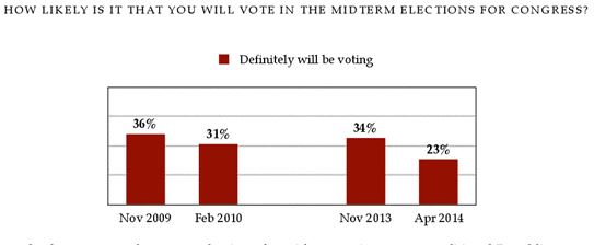 “Despite what seems like growing approval for the president, the Democrats and Republicans in Congress among 18- to 29-year-olds, the percentage of young people who are likely to vote in the midterm elections is shrinking relative to the last time we asked the question five months ago, and also compared to four years ago at this time. Currently, less than one-in-four (23%) young Americans under the age of 30 say that they will ”definitely be voting,” in the upcoming midterm elections for Congress, a sharp decrease of 10 percentage points since the Fall…. Currently, there seems to be more enthusiasm for midterm voting among traditional Republican constituencies than Democratic ones.”