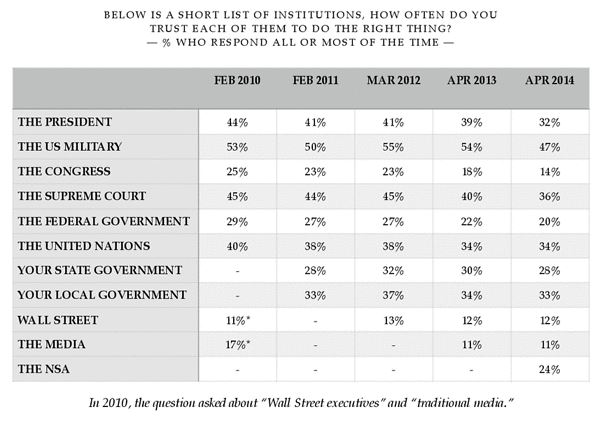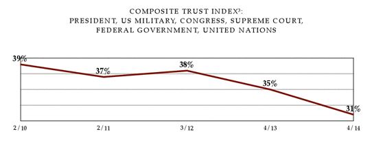 According to the report, just 31 percent of respondents said they trust government, as determined by a composite index that looks at trust in the president, the U.S. military, Congress, the Supreme Court, federal government and the United Nations.