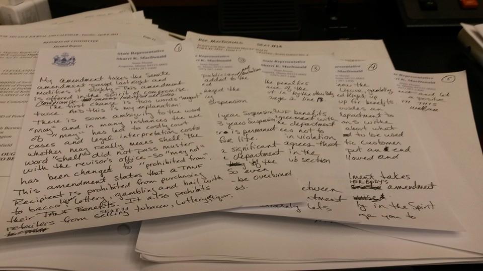 The following is a speech prepared by Rep. Sharri MacDonald (R-Old Orchard Beach) to be given on the floor of the Maine House on Tuesday, April 8, 2014 in support of a compromise amendment she introduced to salvage her bill, L.D. 1822, which would prohibit the use of TANF benefits for alcohol, tobacco, gambling, and posting bail. Democratic majority lawmakers attempted to move the bill before the amendment was prepared and, when the amendment was before the House, moved to prevent a discussion of it. Rep. MacDonald never got a chance to give this simple speech explaining her compromise welfare reform proposal, even though several Democrats rose in her defense to allow her proposal to be heard.