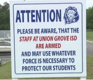 Texas Teachers: One school in Texas has a remarkably simple idea to prevent school shootings: arm the teachers. According to IJ Review, Union Grove ISD, a 2A school district with 761 students in rural Upshur County, has posted signs on campus alerting visitors that school staff are armed and willing to take whatever measures are necessary to protect students. (h/t YoungCons.com)
