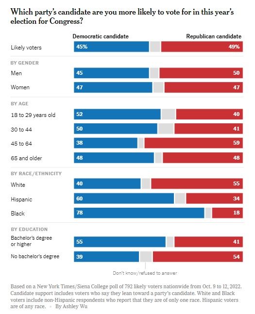 “The poll shows that 49 percent of likely voters said they planned to vote for a Republican to represent them in Congress on Nov. 8, compared with 45 percent who planned to vote for a Democrat. The result represents an improvement for Republicans since September, when Democrats held a one-point edge among likely voters in the last Times/Siena poll. (The October pollโs unrounded margin is closer to three points, not the four points that the rounded figures imply.)”