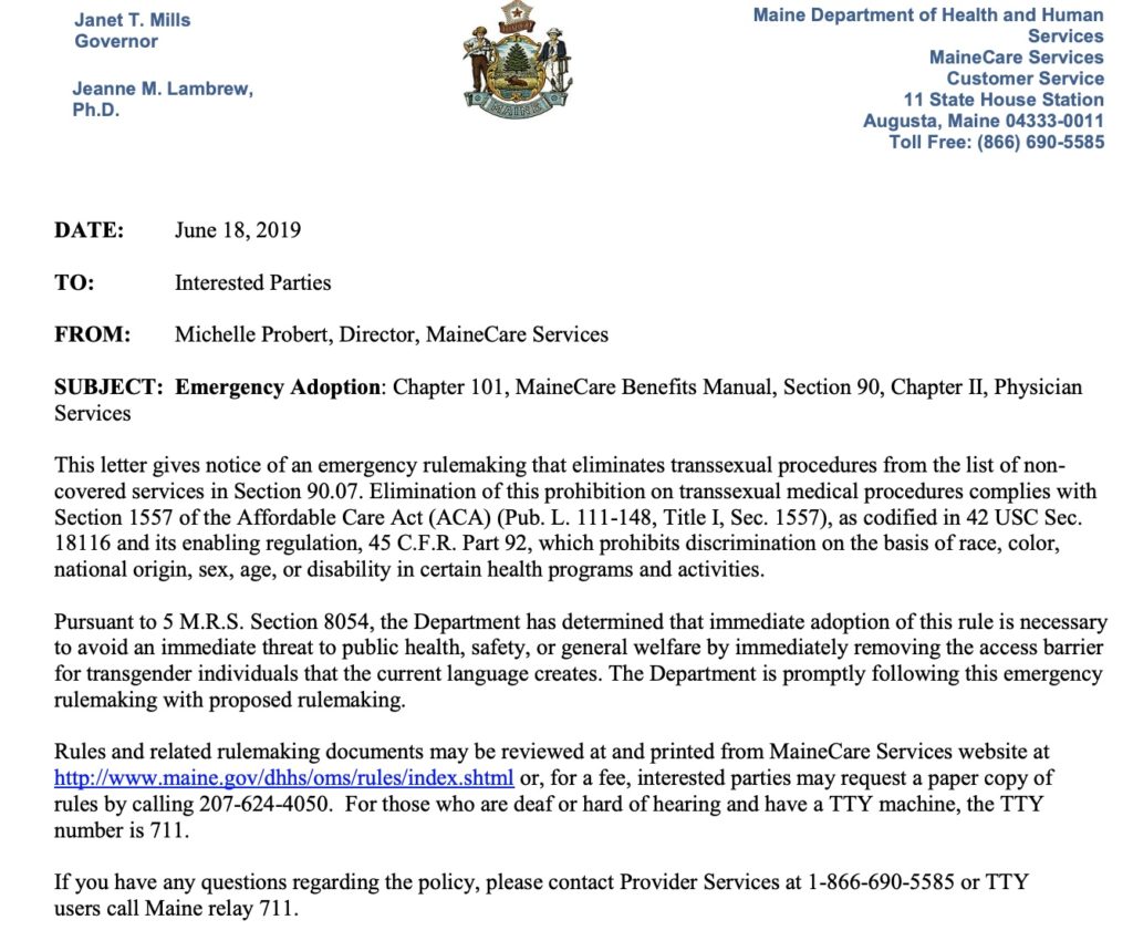 Transsexual surgeries came under the coverage umbrella of MaineCare following an emergency directive by the Mills Administration in 2019.