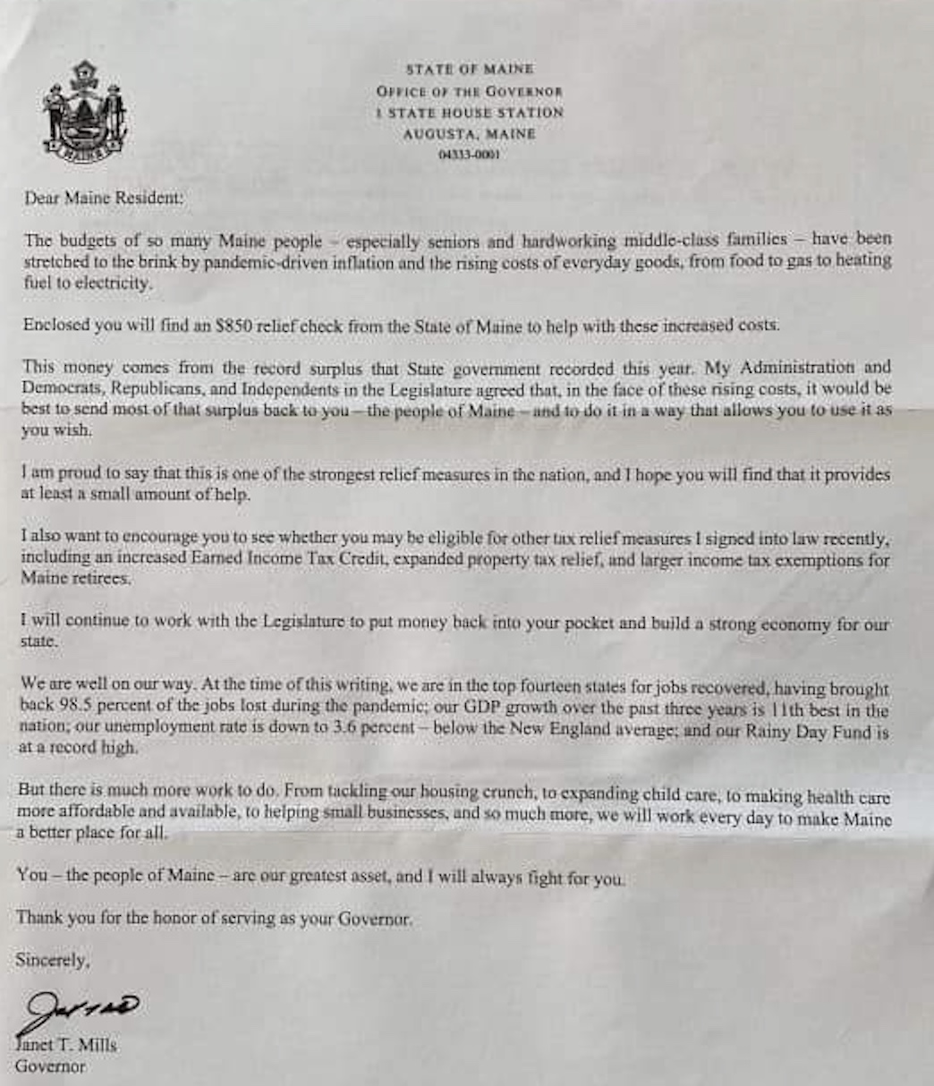 Maine Gov. Janet Mills spent more than $500,000 to mail physical checks, rather than make $850 instant electronic deposits, so she could also include a signed letter taking credit for the payments days before Election Day.