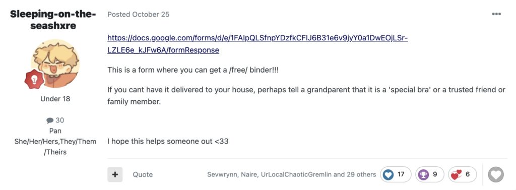 One post, for example, by an anonymous user who claims to be a minor, states: “Is there anyway I can get a chest binder without my parents finding out?”