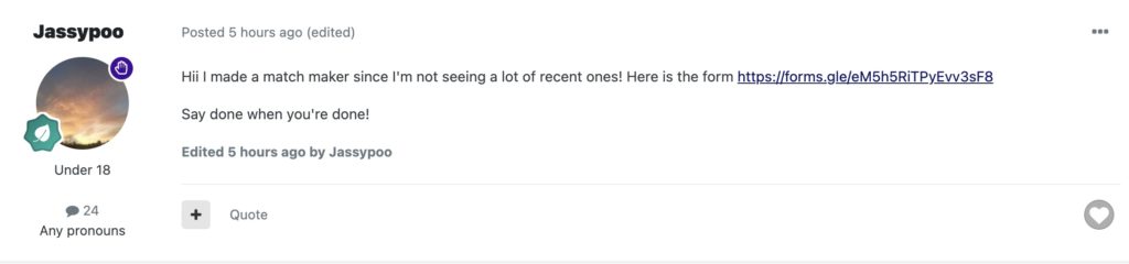 In other instances, users claiming to be minors post links to Google Forms that collect information on users. While the data collection may be entirely innocent, there’s shockingly few safeguards to prevent someone from exploiting the platform for nefarious ends.