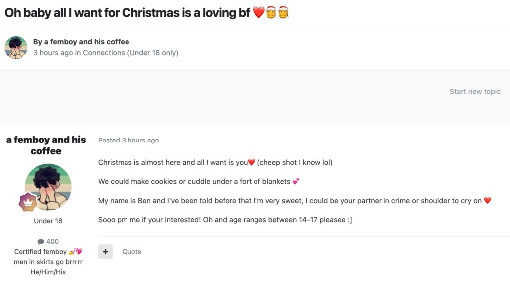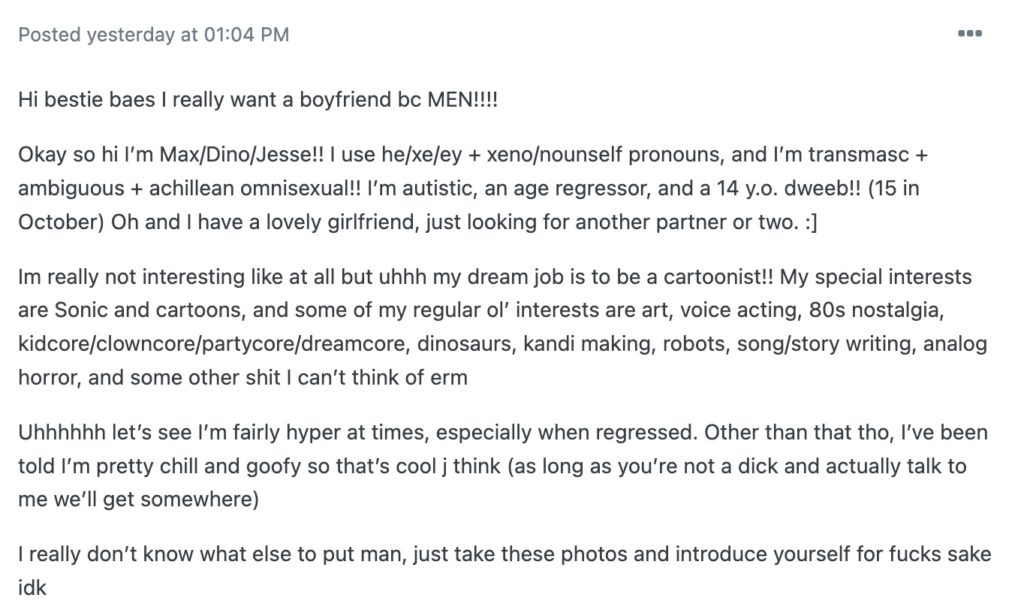 Last week, for example, a self-described 14-year-old posted, “14 genderfluid lesbian looking for partner and/or friends.”