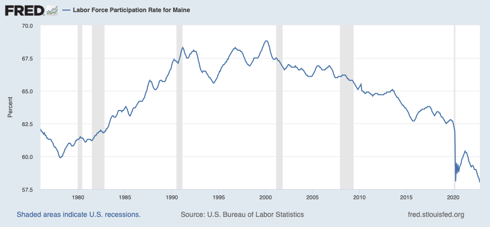This is the lowest Maine’s work force participation rate has been since 1976, which is as far back as economic data from the St. Louis Fed goes.