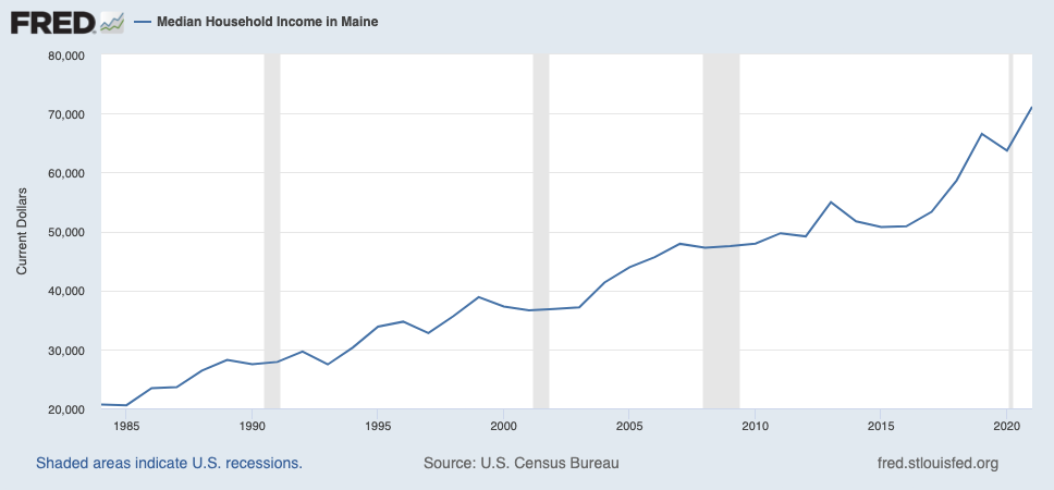 In Maine, the median income for a household is $71,139 — meaning Maine families can make more money by skipping work and enrolling in welfare programs instead.