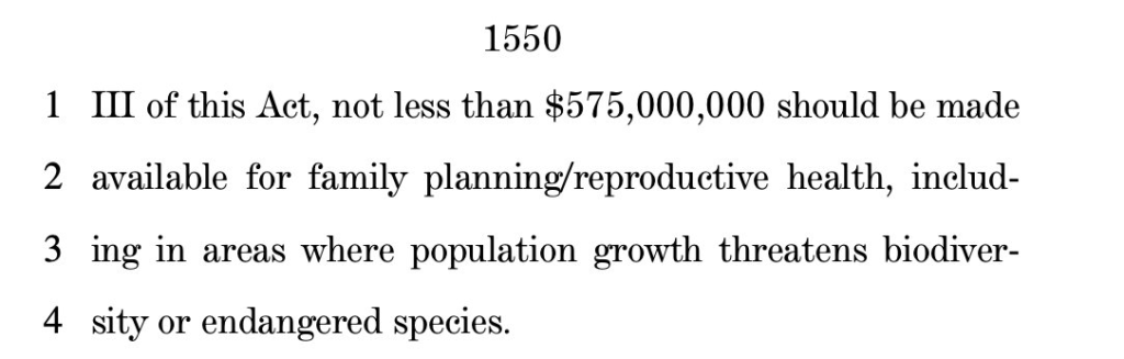 There’s also a $575,000,000 set aside to fund abortions that will protect wildlife. Seriously. The bill states that “not less than $575,000,000 should be made available for family planning/reproductive health, including in areas where population growth threatens biodiversity or endangered species.”