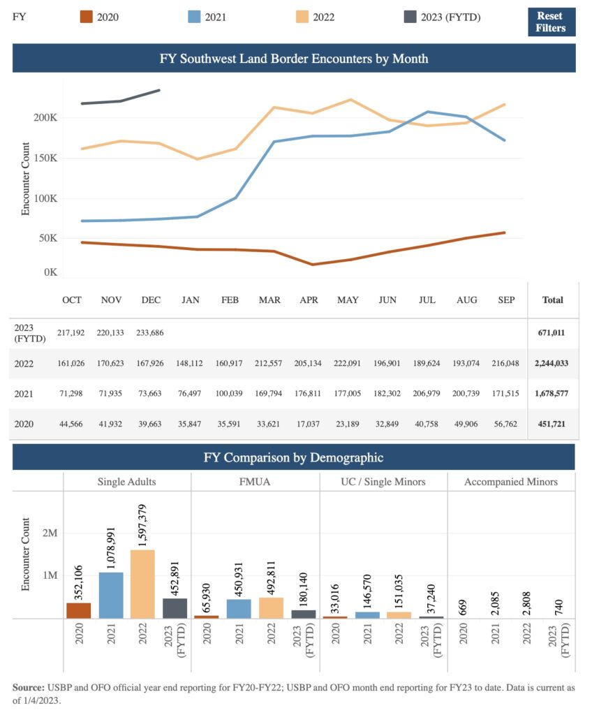 According to CBP, the agency has measured more than 200,000 apprehensions monthly since Sept. of 2022. In Dec., the agency had more than 233k encounters with illegal border crossers, the highest level measured over the last three to four years.