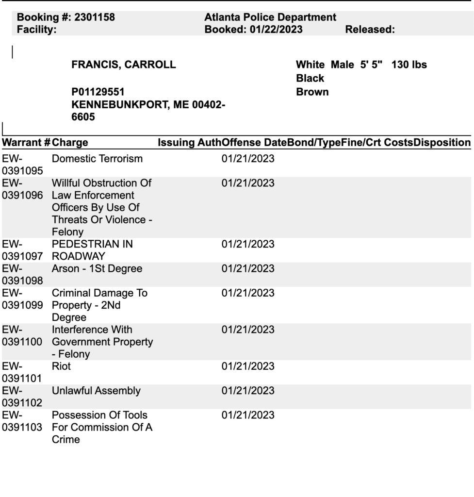 Carroll had previously been arrested in December on similar charges following his participation in an Antifa-organized “autonomous zone” outside of Atlanta. The zone has become a de facto squatters’ village for angry left-wing extremists who oppose the creation of the Atlanta Public Safety Training Center.
