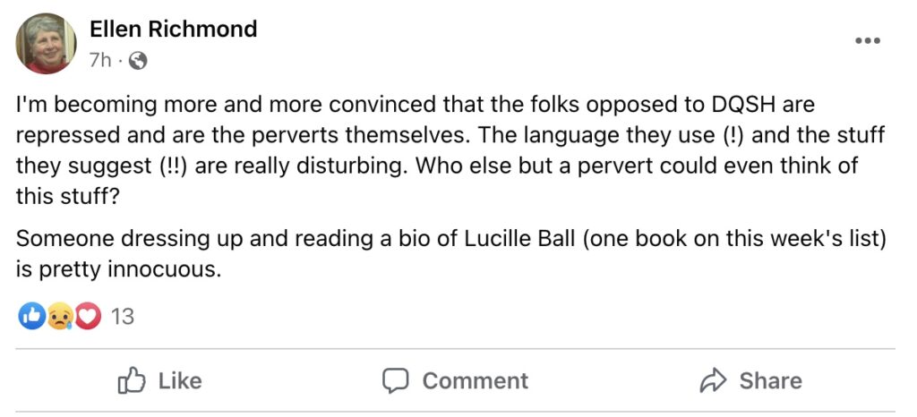 “I’m becoming more and more convinced that the folks opposed to DQSH are repressed and are the perverts themselves,” Richmond wrote in response.