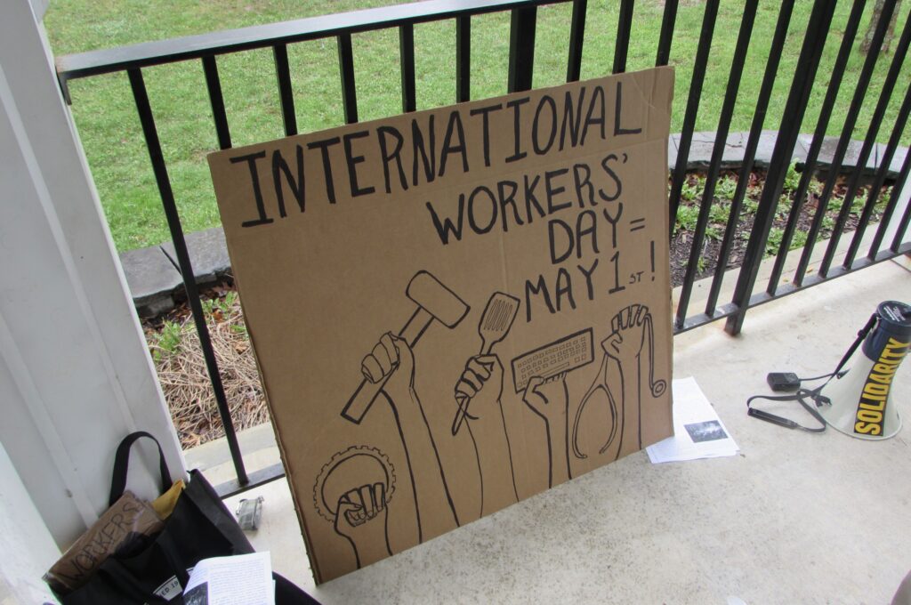 Also present for the May Day event were representatives from the Communist Party USA who distributed recruitment posters for an “Online National Marxist School.”