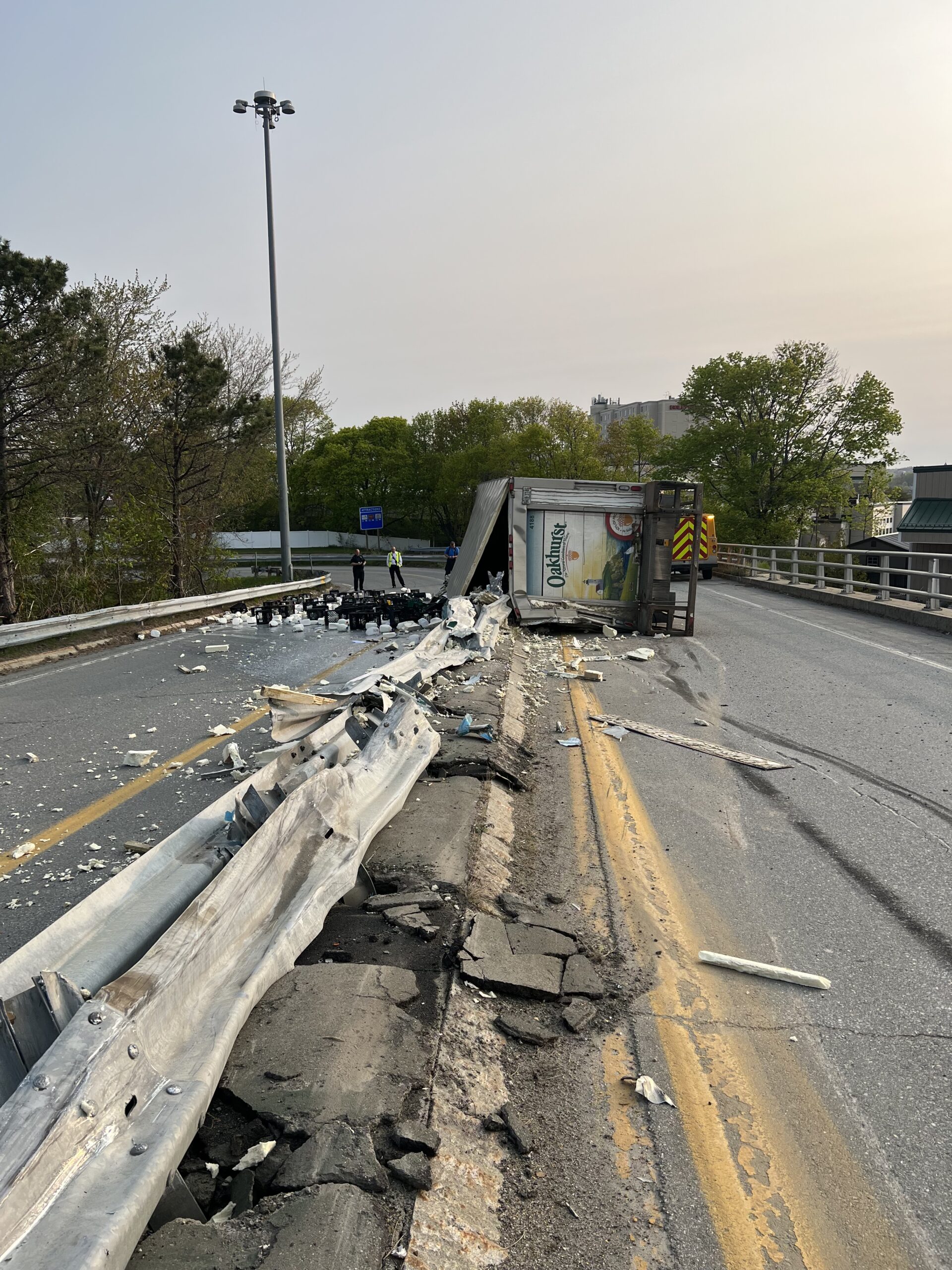 BANGOR, MAINE – A milk delivery truck overturned on the I-395 WB offramp at Exit 3 early Thursday morning, causing a significant spillage of milk onto the roadway and leading to the closure of the ramp.