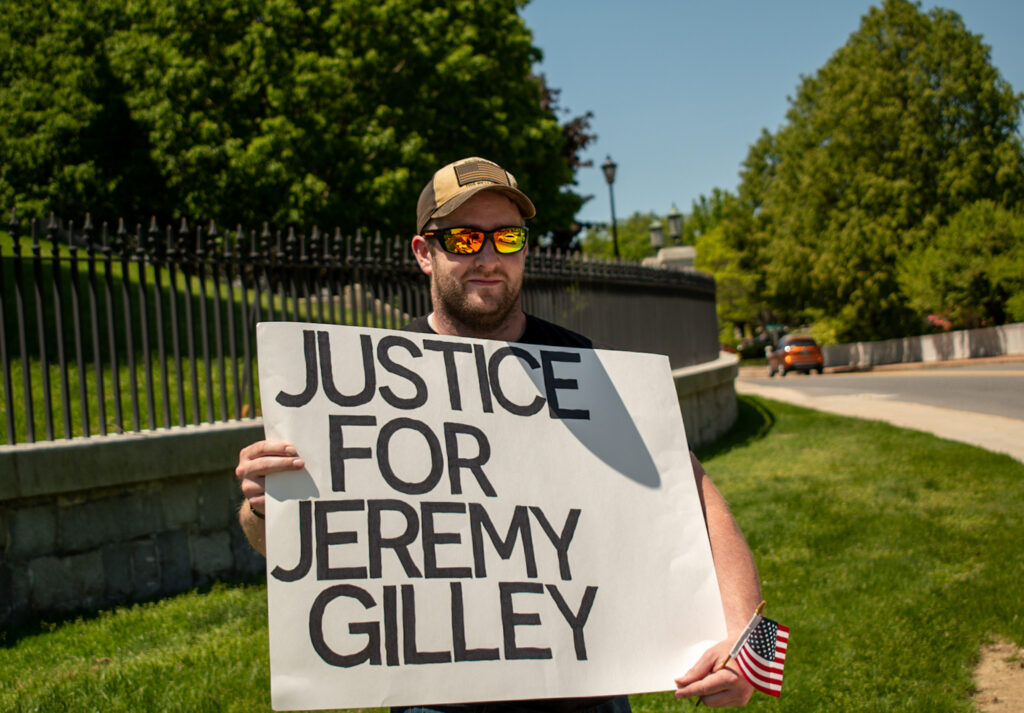 Protesters stood outside the State House Tuesday holding signs with pictures of Gilley and text reading “He fought for us now we fight for him!”, “Honk for justice!”, “Justice for Jeremy Gilley” and “Veterans lives matter.”