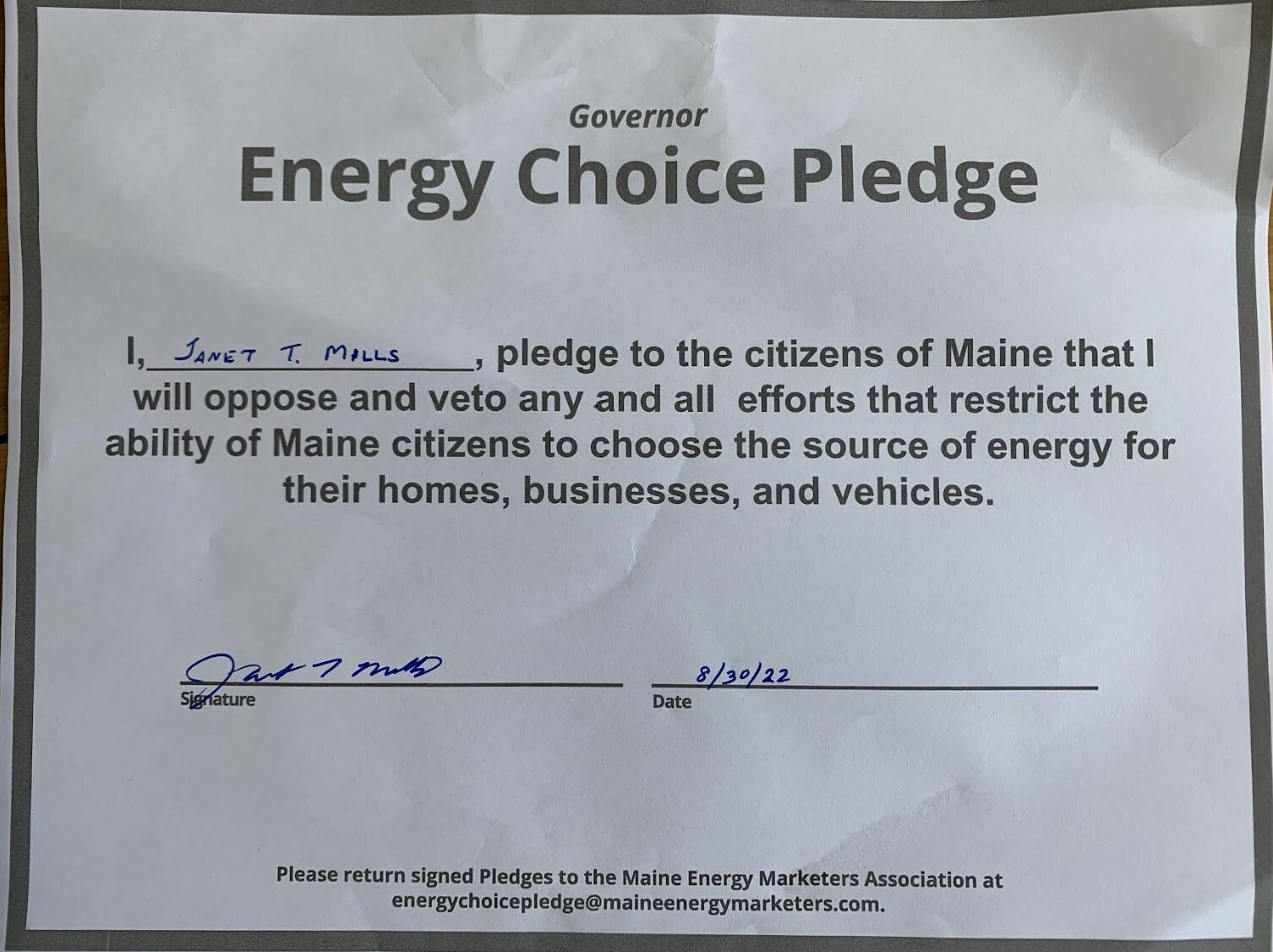 The pledge in question is one devised by the Maine Energy Marketers Association. Below is the copy signed by Gov. Mills.