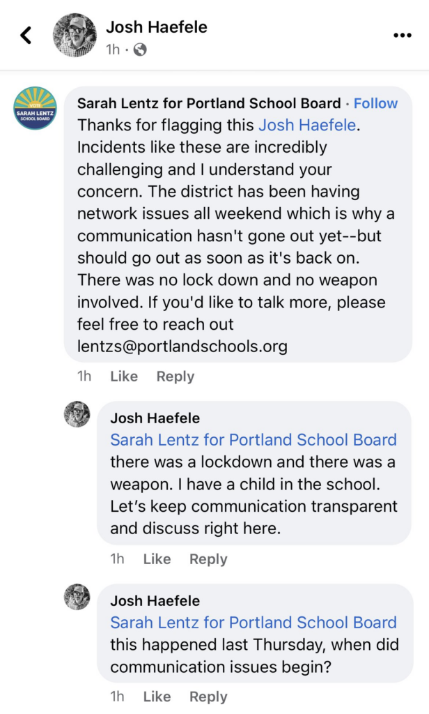 Haefele also claimed that Portland school officials did not initially inform parents about the brawl; however, school board chair Sarah Lentz said the delay was due to a problem with their communications technology.