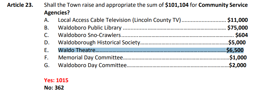 At the 2023 Waldoboro annual town meeting on June 13, the town voted to give the Waldo Theatre $6,500 as one of several “Community Service Agencies.”
