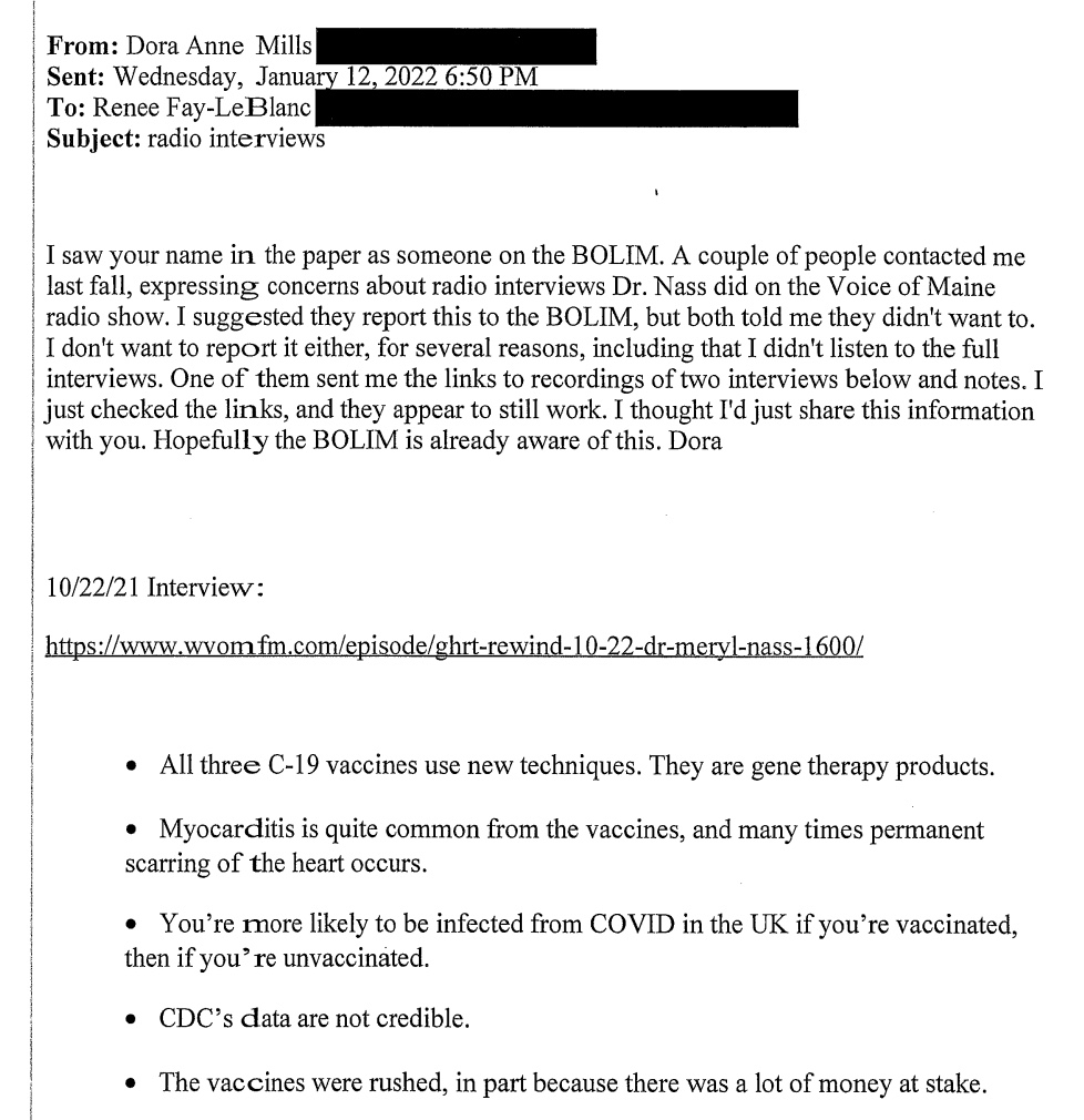 Another complaint to a BOLIM member about “misinformation” came from Dora Mills, a hospital executive and the sister of Gov. Janet Mills.