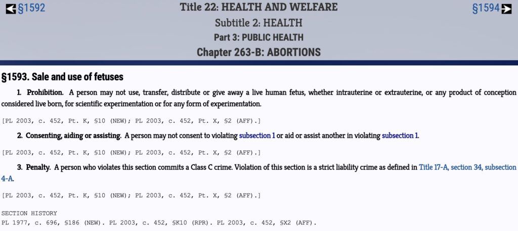 Under Maine’s current laws, it is illegal to donate, transfer, or sell a human fetus — but only if it is alive or was born alive. If the baby is killed with a Digoxin injection before it’s delivered, as is typical with late-term abortions, then the baby’s remains are fair game for researchers at whichever university or pharmaceutical company bids highest.