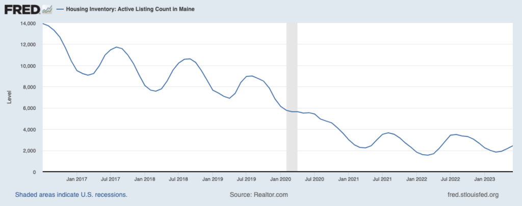 According to housing inventory metrics tracked by the St. Louis Federal Reserve, Maine had 2,439 houses available for sale in June — down from nearly 14,000 at the end of 2016.