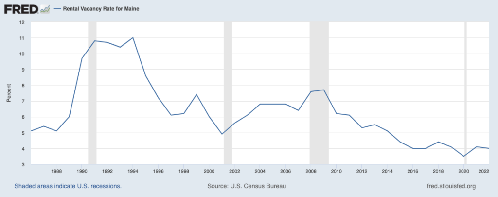 According to data tracked by the U.S. Census Bureau, Maine’s rental housing vacancy is also very low. Just 4 percent of rental units were open to renters in 2022, down 11 percent in 1994.