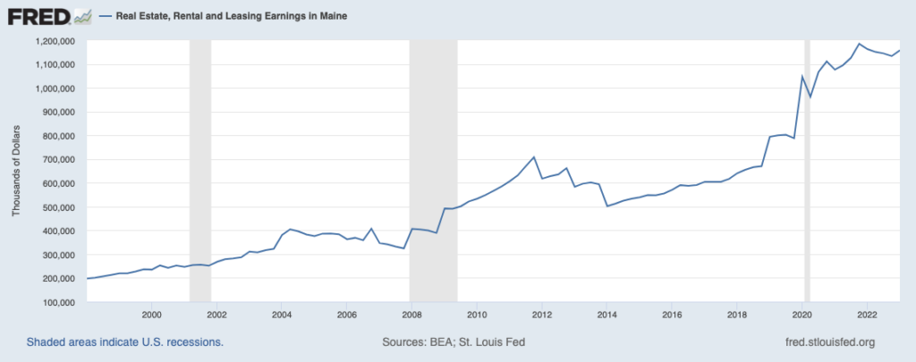 According to data from the U.S. Bureau of Economic Analysis, real estate, rental, and leasing earnings in Maine are near record highs.