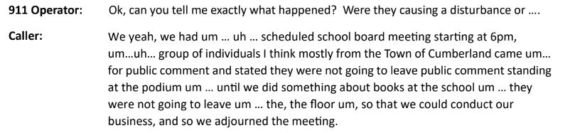 I attended that school board meeting. Nothing happened which could warrant calling the police. Having stated that there was a lengthy agenda which must be addressed, the new board chair demanded and received a vote to adjourn immediately when parents insisted on discussing inappropriate books in the library.