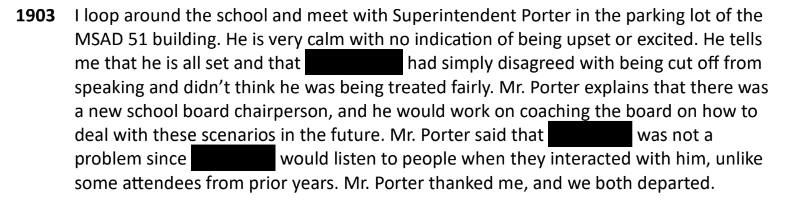 “I recognize him as [redacted],” Ridge states. “We had a brief exchange and I left when he began to air his grievances about the school with me.”