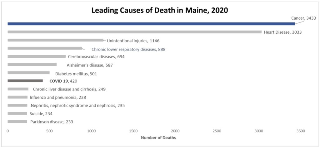 In that same year, cancer killed 3,433 Mainers, while heart disease killed 3,033. Unintentional injuries claimed 1,146 lives, chronic respiratory diseases killed 888, cerebrovascular diseases killed 694, Alzheimer’s killed 587, and Diabetes for 501.