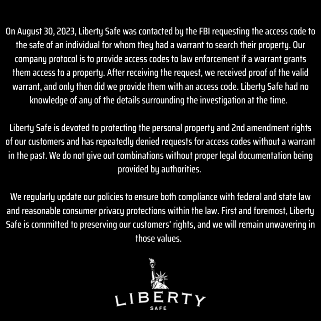 In a statement posted to X/Twitter, Liberty Safe said they provided the combination to the safe after the FBI produced a warrant.