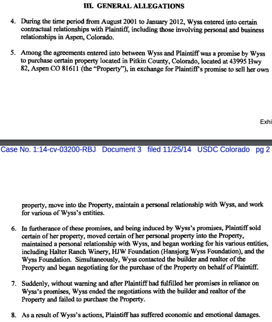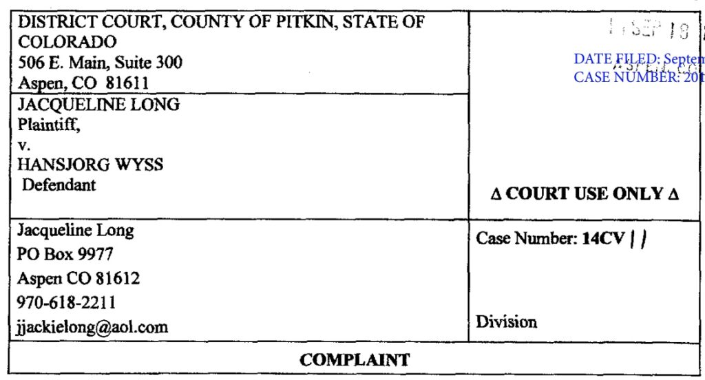 In Sept. 2014, Long filed a lawsuit in federal district court alleging that Wyss enticed her to move to Colorado and enter a “personal” relationship with him before reneging on the deal. According to Long’s complaint, she agreed to move out to Colorado and “maintain a personal relationship” with Wyss in exchange for the house.