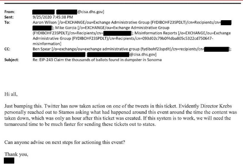In one example from September 2020, Twitter posts regarding an allegation of thousands of ballots found in a dumpster in Sonoma, California, were removed only an hour after a Jira ticket was created — after then-CISA Director Chris Kebbs personally reached out to the head of the Stanford Internet Observatory Alex Stamos regarding the posts.