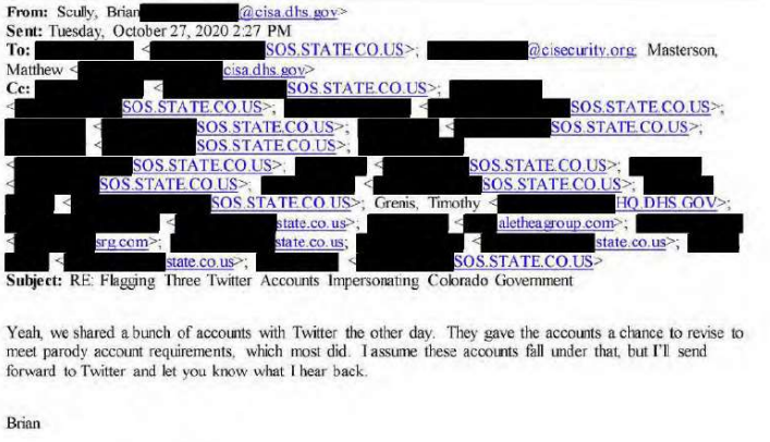 Another email from October 2020 shows a senior CISA official telling the Office of the Colorado Secretary of State that CISA had flagged parody accounts to Twitter.